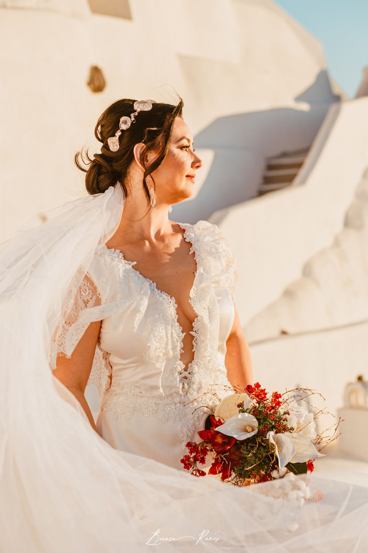 Aninha foi uma noiva tranquila, serena, assim como demonstra nas fotos. Ela trouxe esse lindo bouquet do Brasil, feito a Mao, assim tambem como as lindas joias que usou, a tiara e o vestido. Cada detalhe foi pensado e o resultado foi lindo. A cerimonia foi no Santa Irini que fica em Thira e tem uma linda vista para o vulcano bem no meio da ilha.
