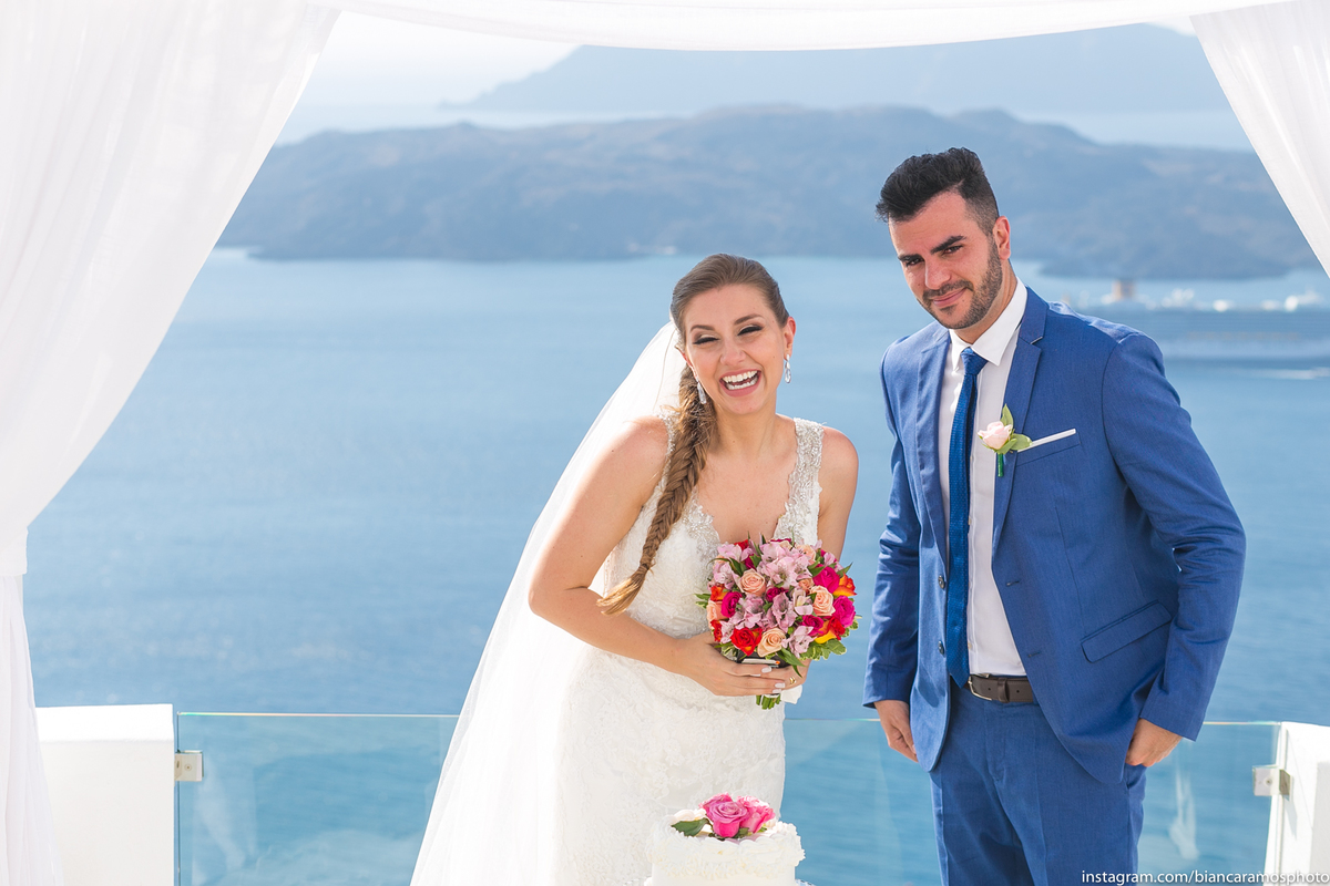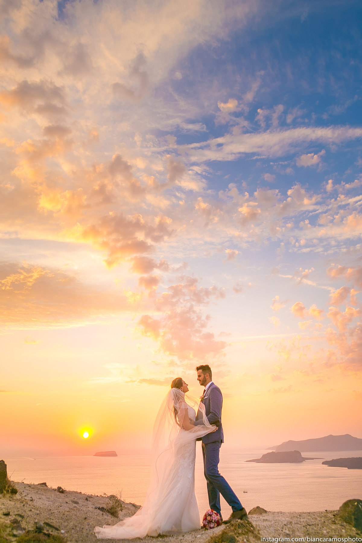 "Nós nos conhecemos através de um App de paquera (Tínder) dia 01/11/2015. Dia 02/11 foi aniversário da Ana e fui o primeiro a dar os parabéns pra ela nesse ano, e tem sido assim desde então. Duas semanas depois já estávamos namorando. Vimos que juntos temos interesses parecidos, a fotografia, as viagens. De lá pra cá, foram 9 países juntos, uma centena de cidades e milhares de momentos inesquecíveis. Em 22/09/2017 ficamos noivos em Cliffs of Moher na Irlanda, um dia especial em que Deus nos presenteou com a aurora boreal nos céus da ilha esmeralda. No começo de 2018 estávamos organizando a lista de convidados para o casamento quando a Ana veio com a ideia, meio que de brincadeira, de casarmos em outro país. Pensei primeiramente nas Maldivas, e a Ana falou da Grécia, era um domingo. Na segunda-feira já estava entrando em contato com a Bianca. Foi tudo lindo, desde o hotel que ela indicou, até os passeios e a cerimônia. Um dia marcante que ficará eternizado em nossas lembranças e no nosso álbum fotográfico mágico."
