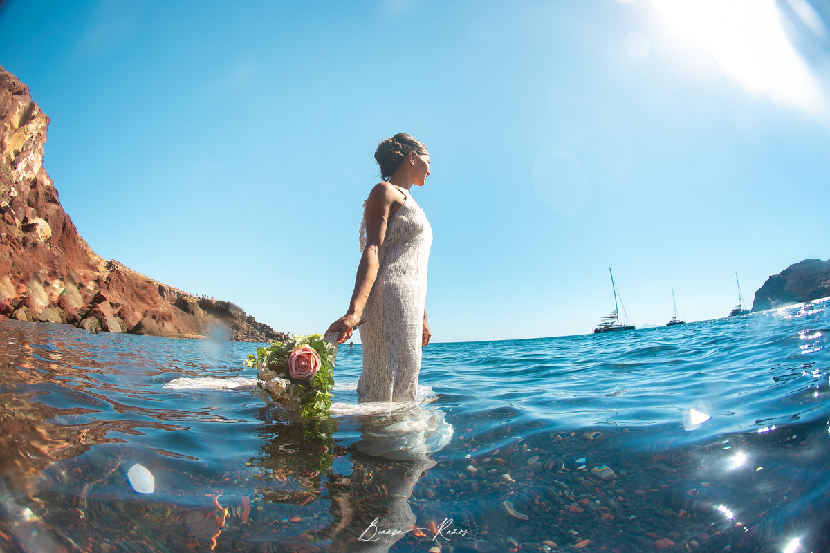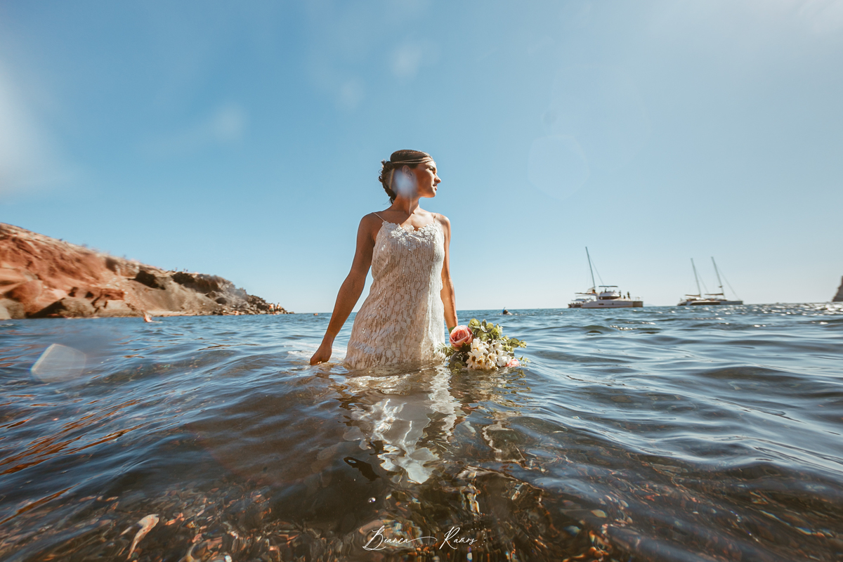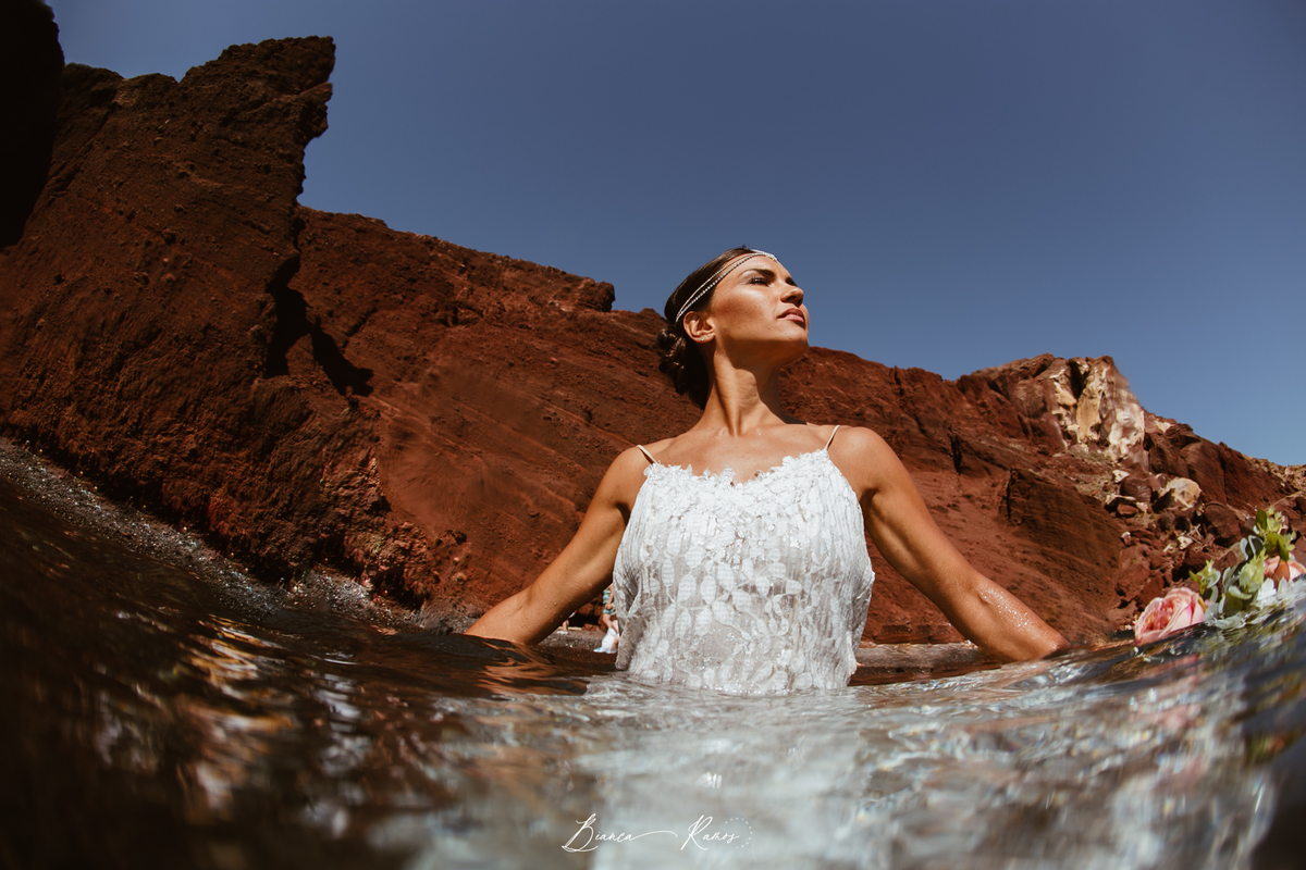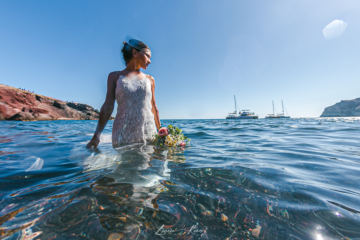 Para quem nao quer uma cerimonia completa, mas quer renovar os votos de casamento em grande estilo, um ensaio fotografico com troca de votos na paisagem Grega é sem duvida, uma ótima opção. A Manu veio com o marido para Santorini e fizemos um dia inteiro de fotos, incluindo fotos na agua!